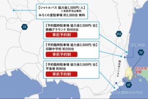 お車でお越しの際は、以下の事前予約制の駐車場か、シャトルバスの利用が推奨されています。